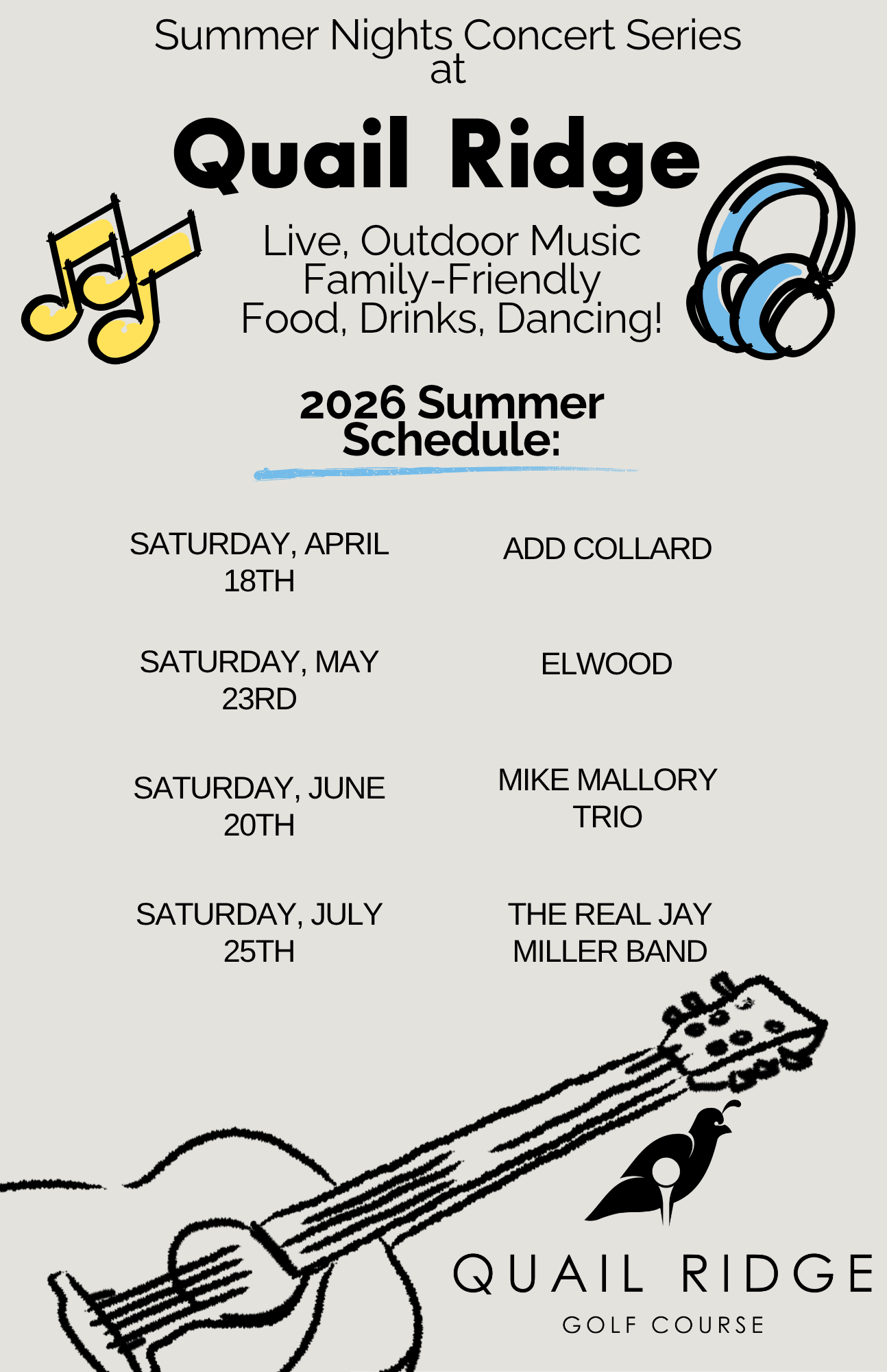 Join us this summer for the Quail Ridge Summer Night Concert Series, where live music meets breathtaking views! Enjoy a night outside with great tunes, delicious food, and fantastic company, all set against the stunning backdrop of our beautiful golf course. With a new performance each month, it’s the perfect way to soak in the season. See you there!